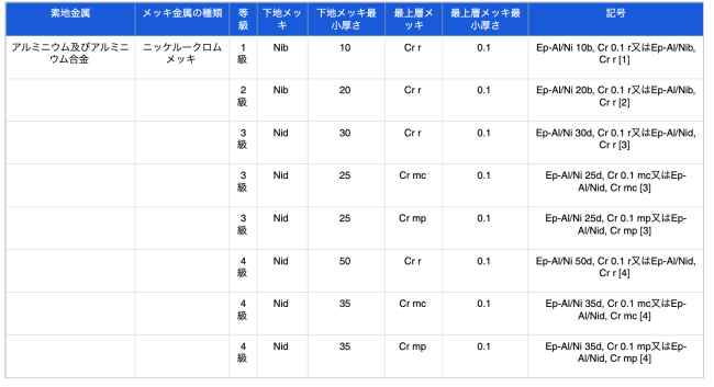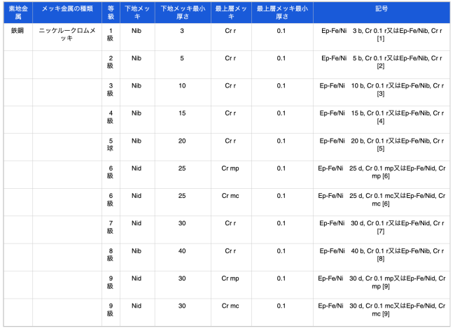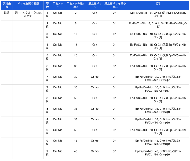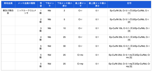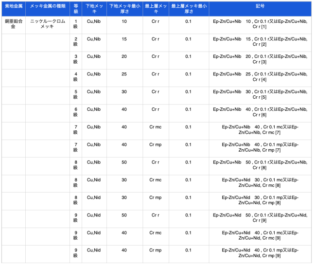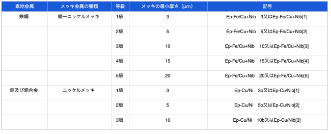 メッキの種類、等級及び記号は、素地金属、下地メッキ、最上層メッキ、メッキの最小厚さによって、表1〜2のとおり区分し、その記号は、JIS H 0404による。