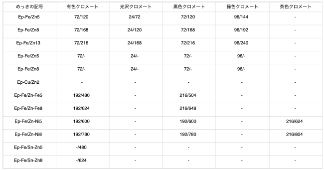 一般的な亜鉛めっきの膜厚は以下の通りです。