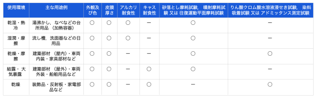 皮膜の特性及び品質については、外観及び色、皮膜質量に示す。このうち適用される製品に必要な特性及び品質は、用途を考慮して取り決めるものとするが、一般に広く必要とされる重要な特性と用途を表1に示す。