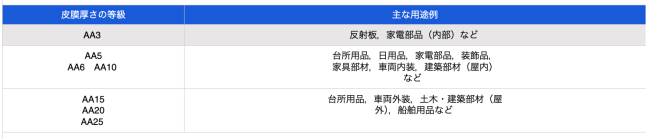 表3 皮膜厚さの等級と主な用途例