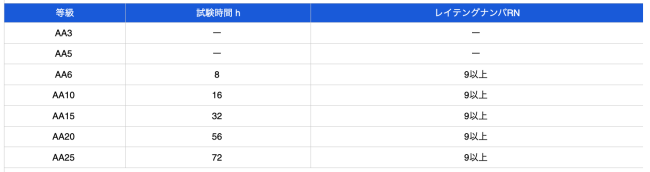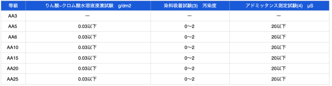 備考.等級AA20以上の皮膜には、起電力式耐アルカリ試験を行い、アルカリ滴下試験を適用しない。