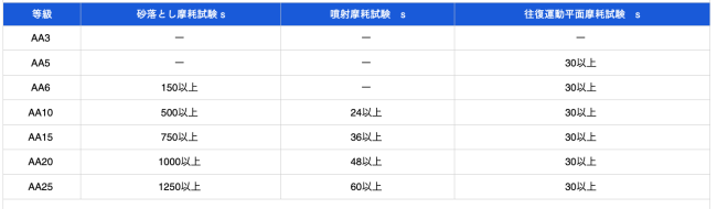 皮膜の耐摩耗性は、摩耗環境に耐える特性であり、用途によっては摩耗性物質の衝突による摩耗、摺動摩耗及び転がり摩擦などの摩耗環境に耐える特性が要求される場合があるが、その品質は表6のいずれかに適合しなければならない。なお、噴射摩耗試験の耐摩耗性は、導通判定法によることとし、素地が露出するまでの摩耗時間[WJ(T)]で表す