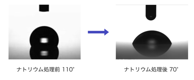親水性付与を目的としたナトリウム処理の実績として、特にPFAコーティングに適用した場合、処理前は接触角が90度以上であったものが処理後には約70度程度まで低減され、親水性が確実に向上することを確認しています。