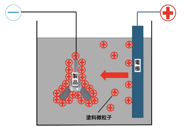 電着塗料の中に製品を浸漬し、直流電流をかけることで塗膜成分が荷電し、被塗物表面に電着させる手法です。