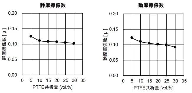 PTFE共析量が増えるほど摩擦係数は低下し、摺動性が向上します。