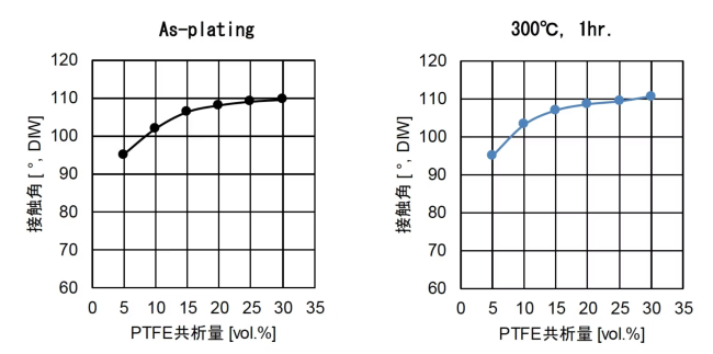 PTFE共析量が高いほど接触角が大きくなり、撥水性・防汚性が向上します。