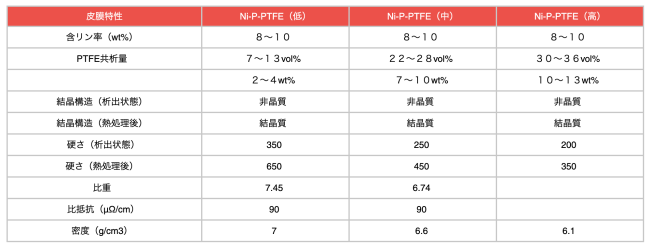 テフロン無電解複合めっきでは、PTFE共析量(体積比)を 低共析・中共析・高共析 の3種類から選択できます。用途や求める性能に応じて最適なタイプをお選びください。
